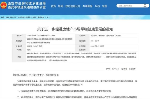 5月9日,陕西省西安市住房和城乡建设局、西安市资源规划局、西安住房公积金管理中心、国家税务总局西安市税务局联合发布《关于进一步促进房地产市场平稳健康发展》的通知。其中提到,全面取消西安市住房限购措施,居民家庭在全市范围内购买新建商品住房、二手住房不再审核购房资格。