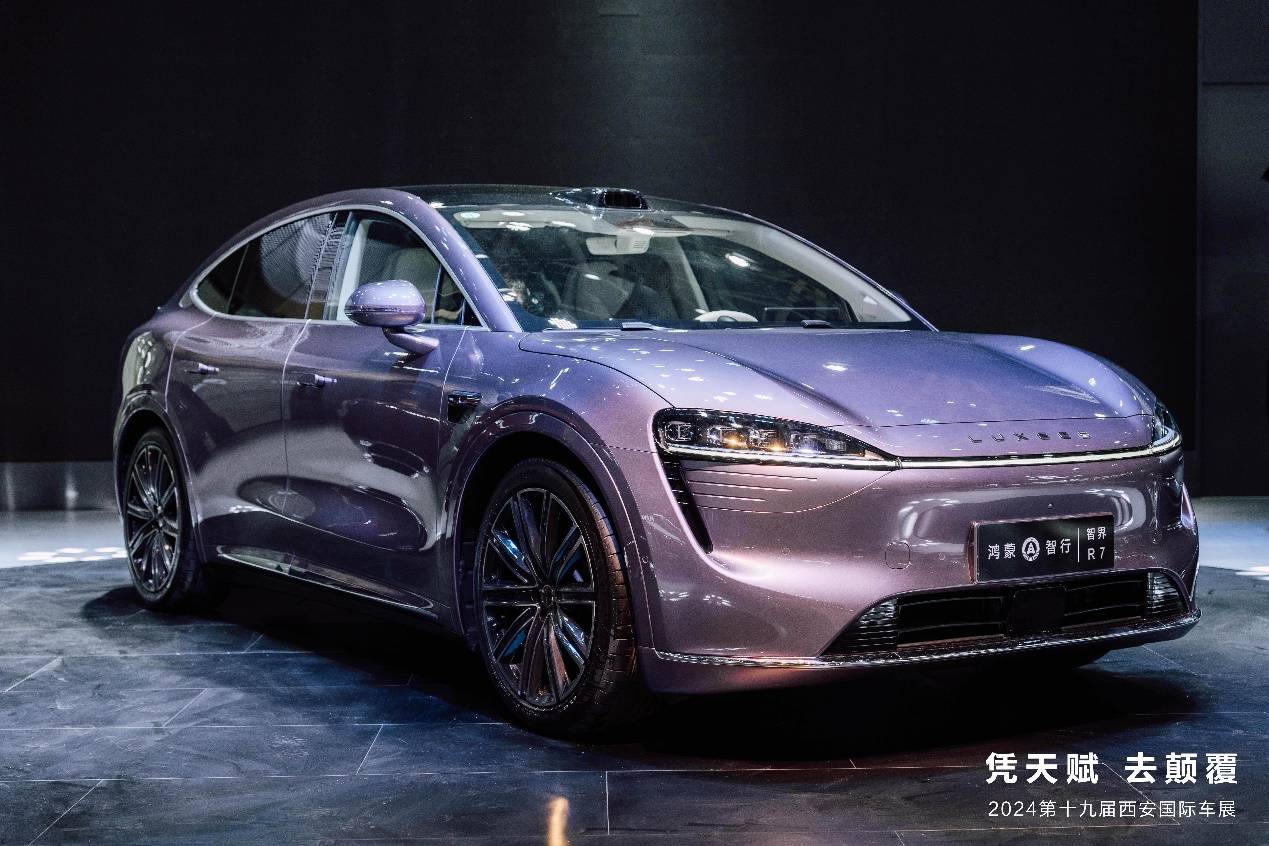 鸿蒙智行首款智慧轿跑SUV智界R7迎来在西安的首次实车亮相,成为展台当之无愧、拥有最高人气的“流量王”,它拥有优雅流畅的轿跑造型,并通过极致优化的空气动力学设计,实现了全球量产SUV最低风阻。同时,智界R7通过C点前移、D点抬高的创新比例,打造远超传统轿跑SUV的超大空间,为用户带来颠覆驾乘体验。此次亮相的智界R7分别拥有幻影紫、晴光蓝和深空灰三种颜色。其中,幻影紫、晴光蓝为两款全新印象色系,前者高贵而浪漫,后者明亮而灵动,符合年轻人的审美。创新Knock Knock电吸电弹前备箱,双击一下,快乐即刻开启!